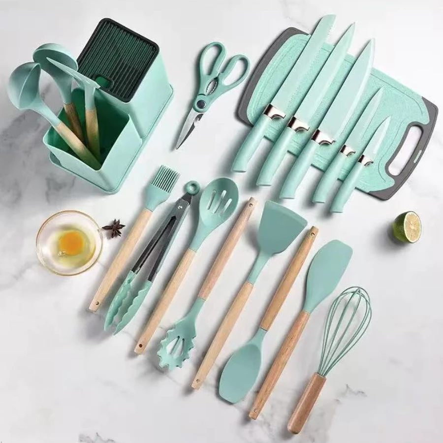 Com design moderno e elegante, este kit reúne todos os utensílios essenciais para o preparo de qualquer receita: facas afiadas, espátulas, colheres, fouet, tesoura, pegador, pincel e muito mais.